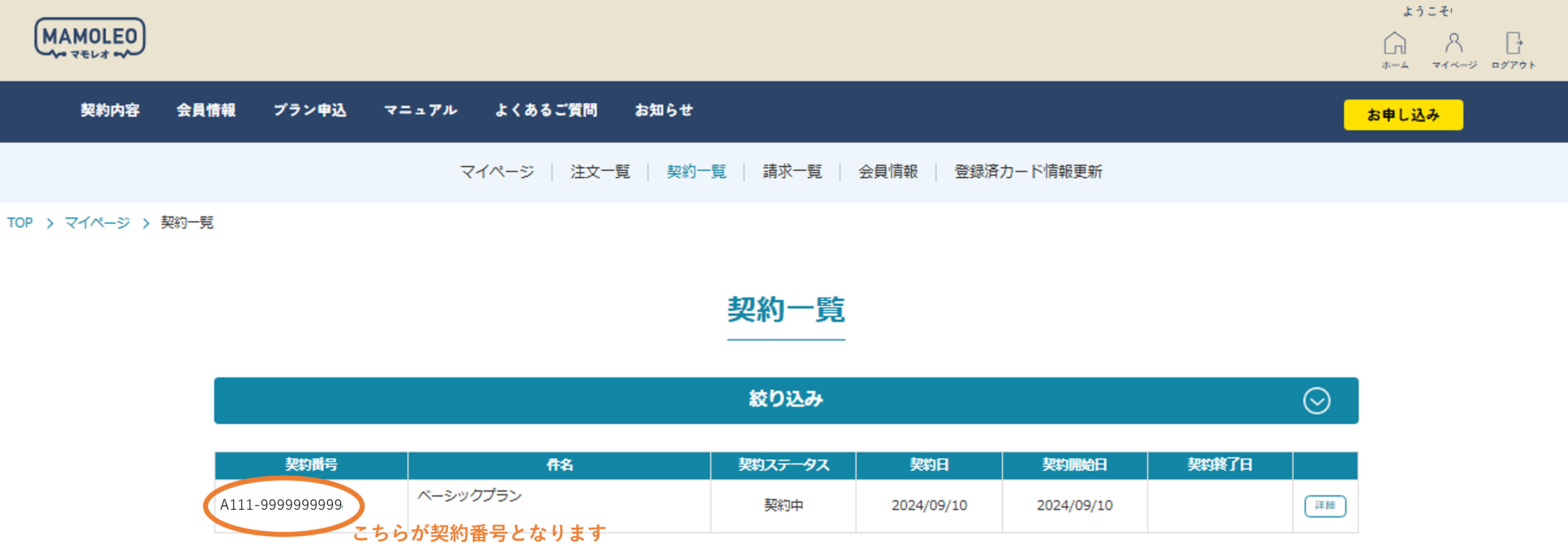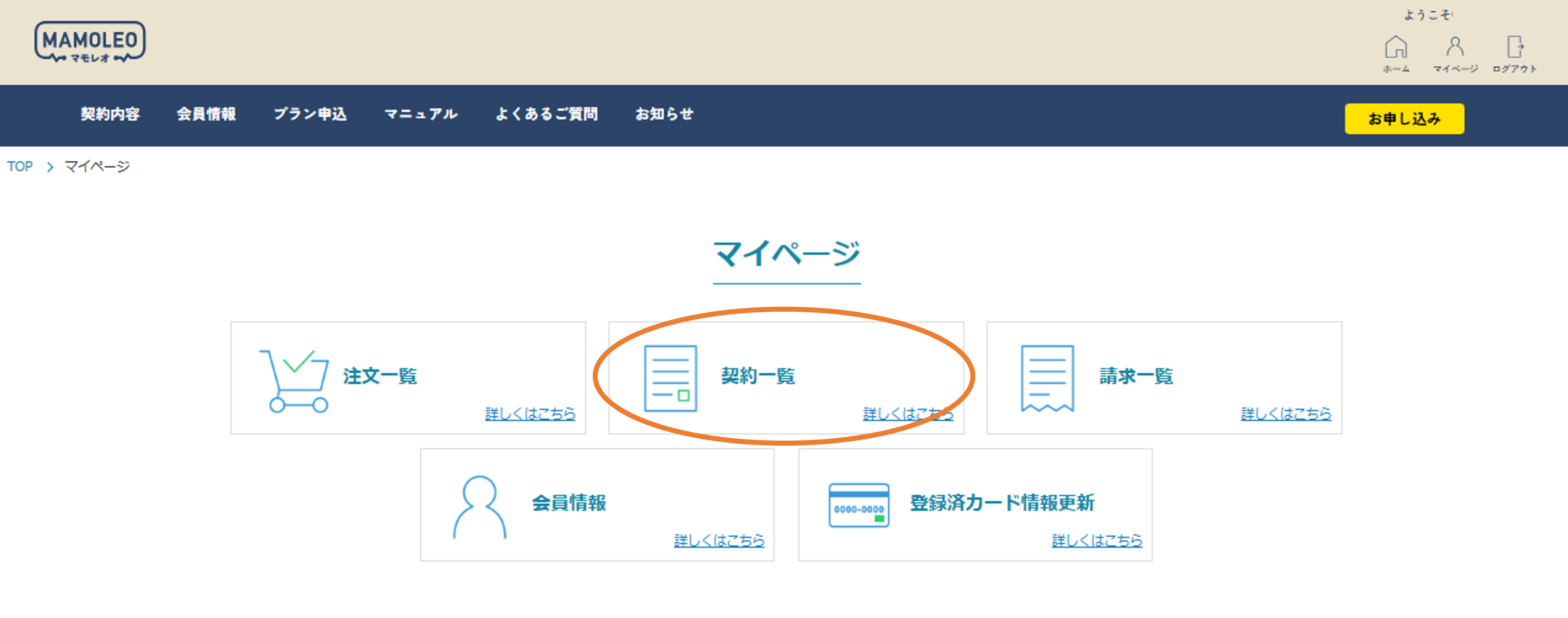 契約番号の確認方法について知りたい ご利用方法 1.MAMOLEOストアマイページへログイン2.マイページ「契約一覧」アイコンをタップ ※上記1以外の方法でログインすると「マイページメニュー」と表示されるため、「契約内容の確認・変更」をタップすると、下記3の画面に遷移いたします 3.契約番号がご確認いただけます